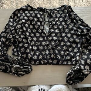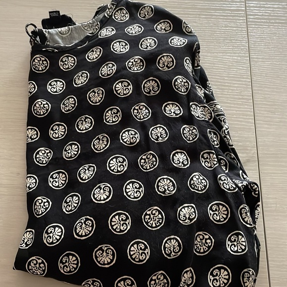 Gently worn. Nicole miller New York, black and white top size small. Has keyhole in the back with adjustable strings. Waistband and sleeve cuffs are elastic so they can stretch. Smoke free home and pet friendly!