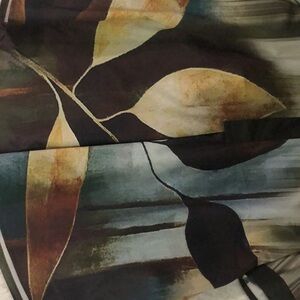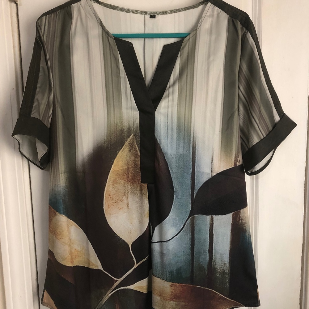 Polyester top. Leaves design. Has v neck. Cuffed sleeves