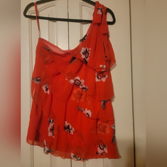 One shoulder layered top in beautiful sheer fabric with silk lining. Great with a skirt for cocktail or evening look. or with jeans for a girls' night out.