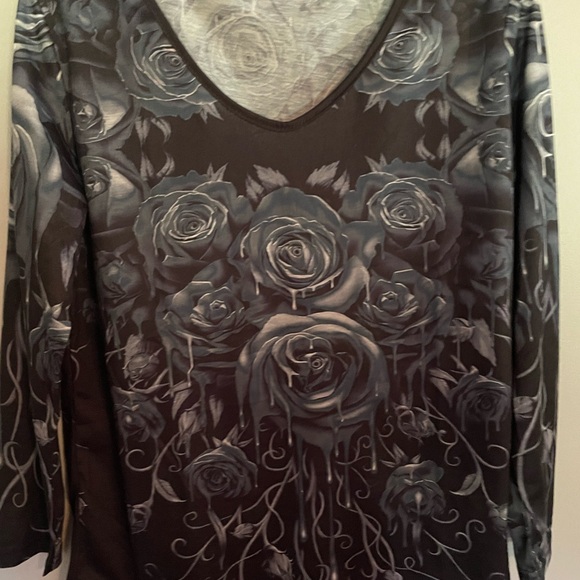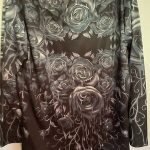 If you are a little dark or need a new Halloween shirt, check out this dripping roses shirt. A had to have but never worn purchase! Lightweight polyester with rounded v-neck. Long sleeves.