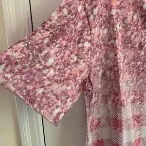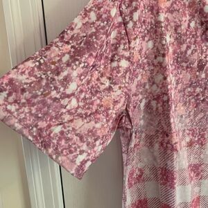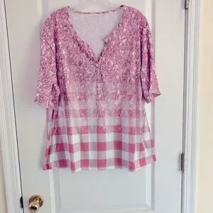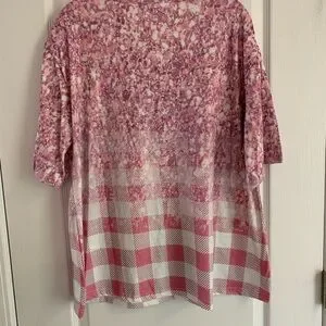 Pink and white top. 3 button v-neck. NWOT. Approximately 26 1/2” long and 22” pit to pit. Smoke and pet free.