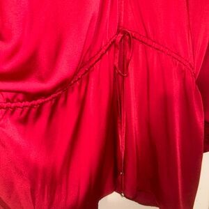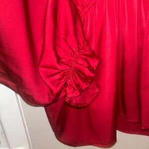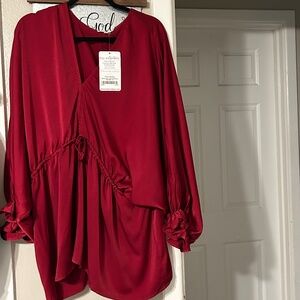 Red silky oversized shirt. XL but can fit up to 2x. Oversized arms as well. Flowy stretchy waist band on the front