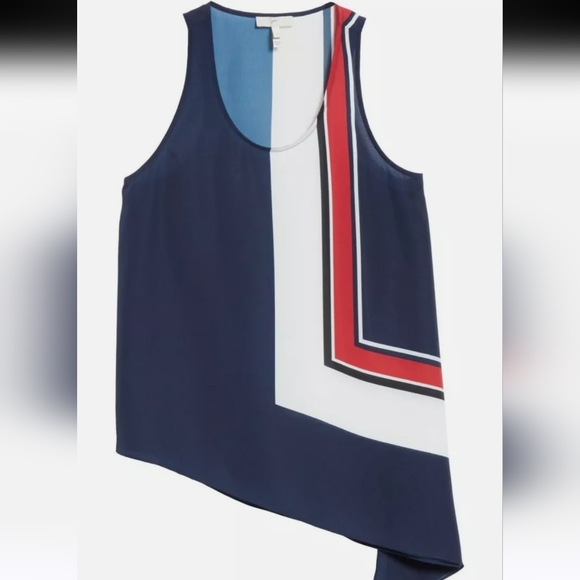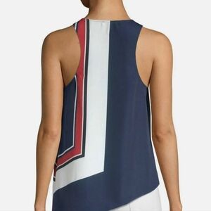 Nautical-inspired color blocking accentuates the flowy asymmetrical cut of a chic and easy woven tank with a slight racerback.