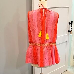 Fun sleeveless top with a smocking waist. Tassle tie at neckline. Orange and punk with yellow stitching and tassles.