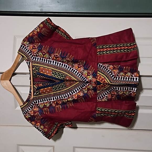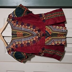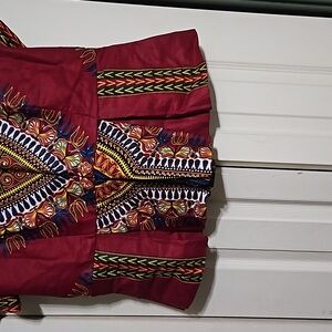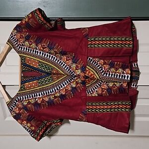 This is a handmade top, no label, very heavyweight material, Brilliant colors, peplum bottom, back zipper. V neck collar in front.