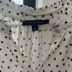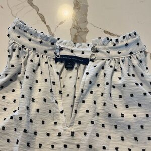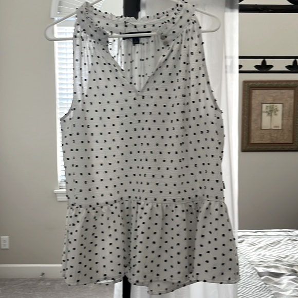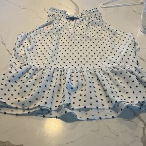 Sleeveless top. Cut in shoulders ruffled bottom. Washable.