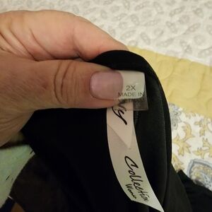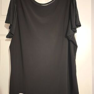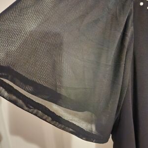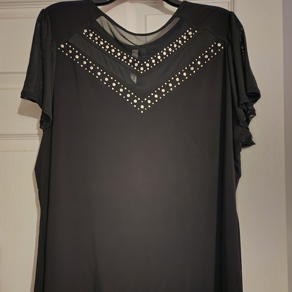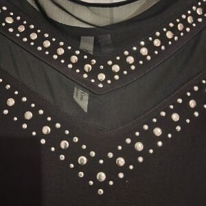 Dressier black top with beautiful studs on the bodice. Sheer short sleeves. p-p/24" | n-h/24". Made of Polyester/Spandex