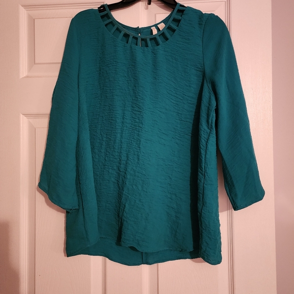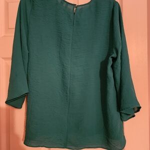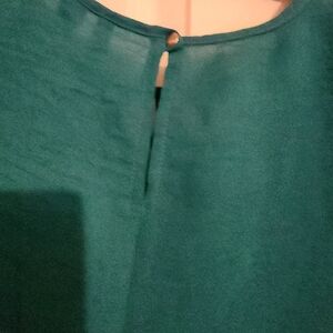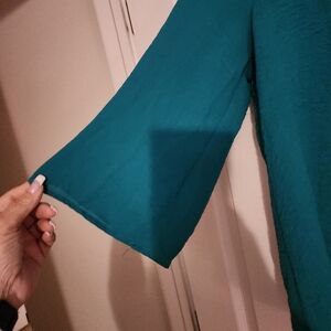 Made of Polyester with 3/4" sleeves, cool and breezy, only worn a couple times. p-p/24" | n-h/22.5", Teal color