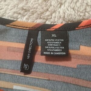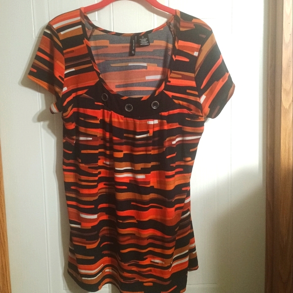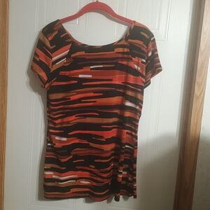 Beautiful short sleeve top. Black, orange, white, and brown; akin to an animal print or modern camo. Lightweight polyester spandex fabrication. 27 inches long. Size XL.