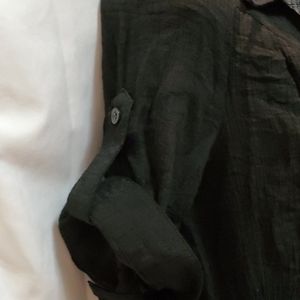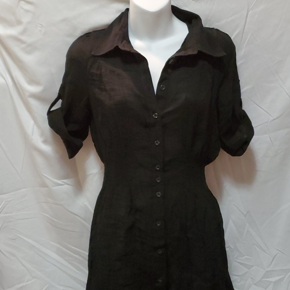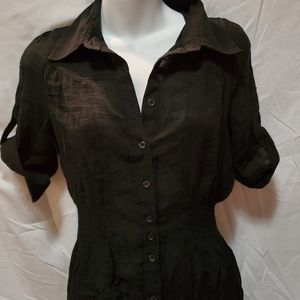 Black short sleeved sheer button down blouse. Long enough to wear with leggings. Length - ~30 inches Bust - ~ 18 inches Waist - ~12 inches 67% Rayon 33% Polyester