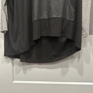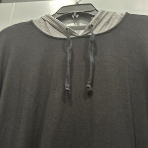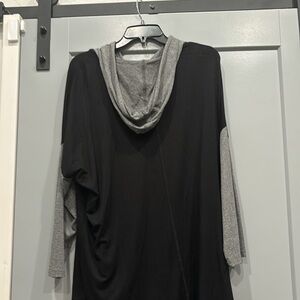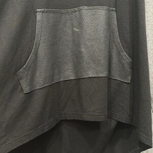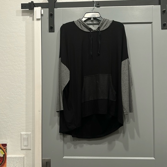 90% rayon and 10% spandex black with grey sleeves and grey hood top