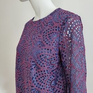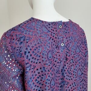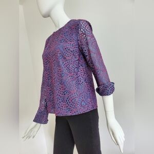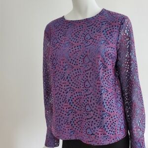 Sheer look top, 2 button cuffed sleeves can be worn as is or rolled. Bodice is lined and sleeves are sheer. Top measures 15" across shoulders and has two button closure on back, sleeves are 23" long and the top itself is 22" long.