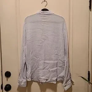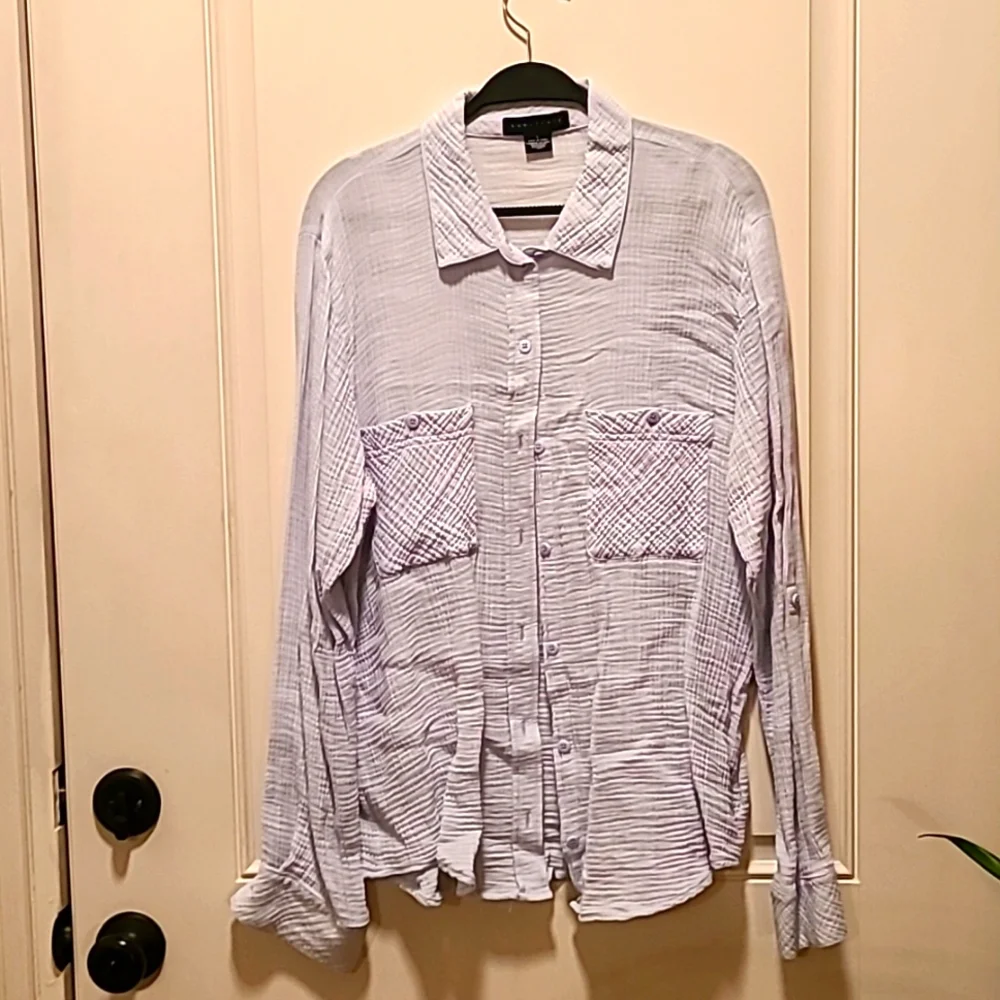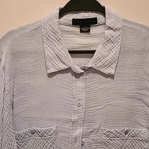 Sky blue button up blouse relaxed fit waffle knit pattern.