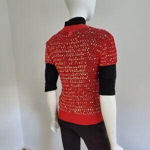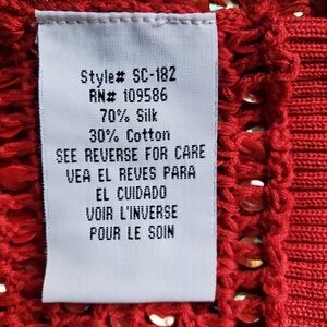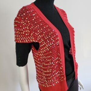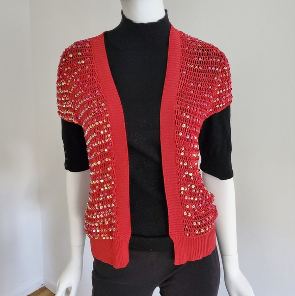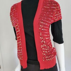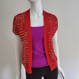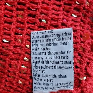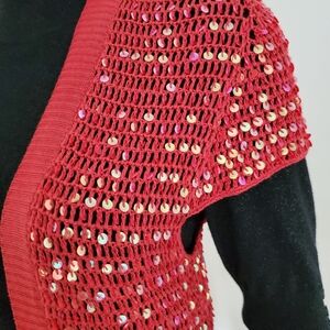 Open knit sequined top. Dresses up anything. Can be worn just as a cover up, with a tank or camisole or light sweater..very versatile. 16" across back shoulders/ 22" long. Never worn..color is a more of a cherry red.