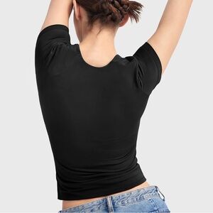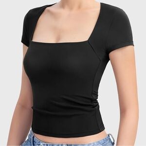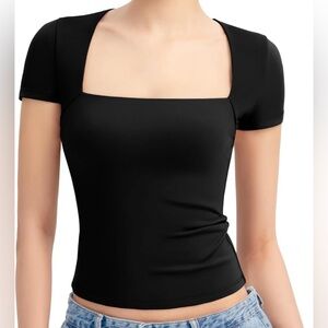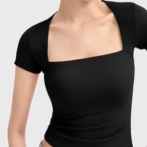 Black square neck stretchy top, worn only once to model