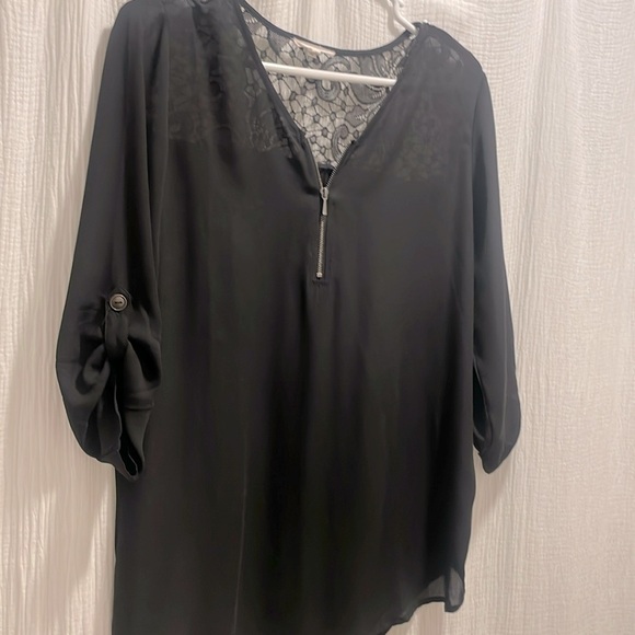 Upper back lace detail three-quarter zip in the front three-quarter sleeve This is oversized. I usually wear a medium.