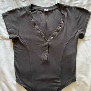 Adorable cropped top from Garage. Short cap sleeves, v-neckline with snaps, and a shirttail hem.