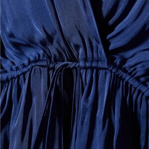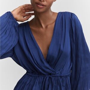 Satin fabric. Crossover design. Straight design. Wrap collar. Long sleeves with elastic cuffs. Gathered details. Adjustable waist tie. Office looks.