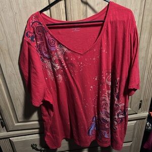 This top is short sleeve with a relaxed fit and vibrant red. It’s perfect for a casual occasion goes well with shorts, jeans, or even capris. Would look nice for 4th of July