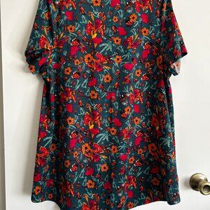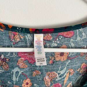 Beautiful deep colors in this soft LuLaRoe, well made top. Like new condition in size 2XL. Material is 95% polyester and 5% spandex. Length from shoulder to front hem is 30 inches. Hem is a high/low hem.