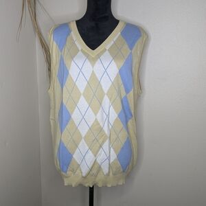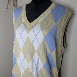 Elevate your style with this classic argyle sweater vest. Featuring a sophisticated blend of blue, white, and tan, this piece is perfect for layering.