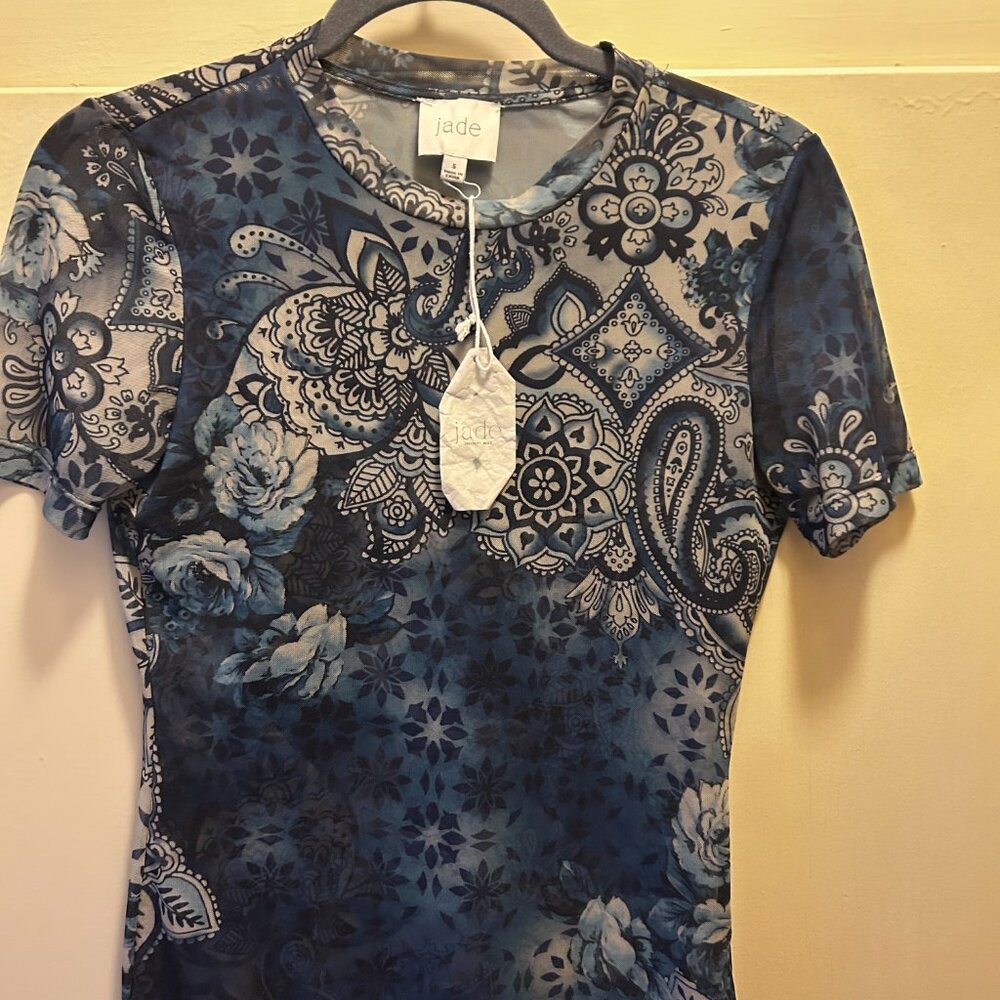 Very light, see through top. Multicolor,, blue tones. Never worn