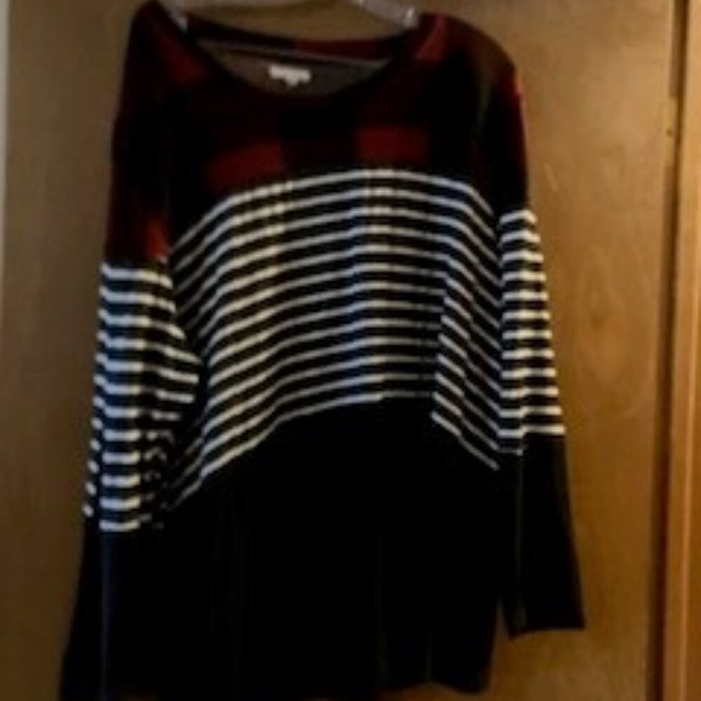 This top has black and red plaid pattern at the top, then black and white strip in the middle with solid black along the bottom. It is long sleeves. 75% rayon, 22 polyester and 4 % spandex. It is very light weight