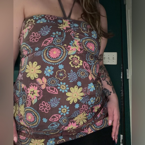 Vintage Andrew and Co medium brown floral tie top. Full length top. 100% cotton.