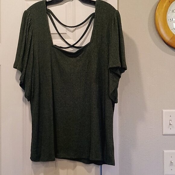 Rib knit shirt with ruffled short sleeves. Has never been worn. still has tag on it. Size 2 from Maurice's. color is a dark green. Has square neckline. Criss crosses in back.