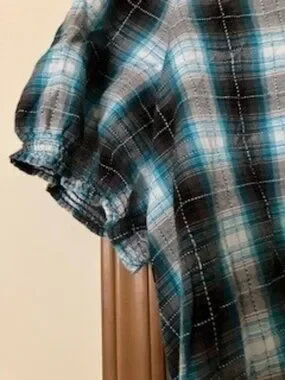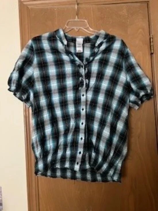 Short sleeve blue and black plain button up shirt. It has elastic around the bottom as well as the sleeve bottoms. The is a small ruffle from collar to just above the third button from top. 100% Algodon