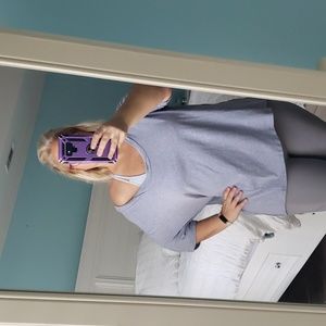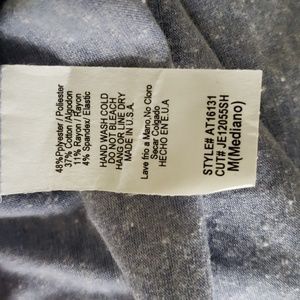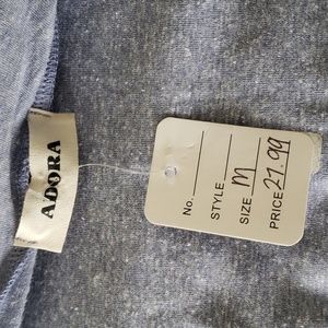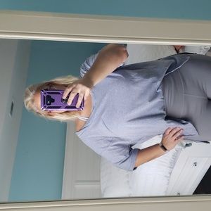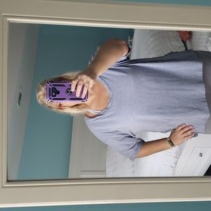 💙 Blue top is super comfy! I took the picture in leggings so you can see fit, but paired with jeans and the tuck in, is so cute! Also comfortable enough to use as a work out shirt. Great neck line and cuffed sleeves. Dress up or down. Brand is Adora.