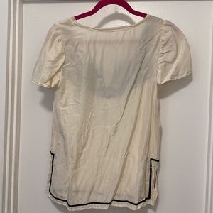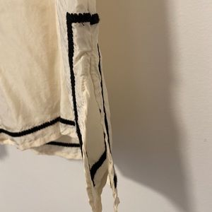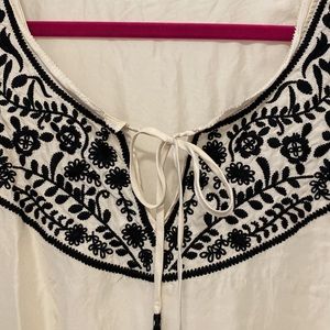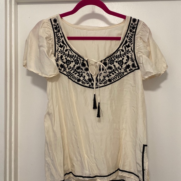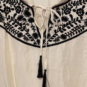 This beautiful embroidered blouse is fun, cool, comfortable and unique. Paired up with jeans or black pants or shorts and you’ll look great!! No tag inside. Material could be silk or a silky polyester. Size probably medium.