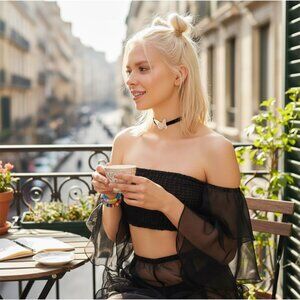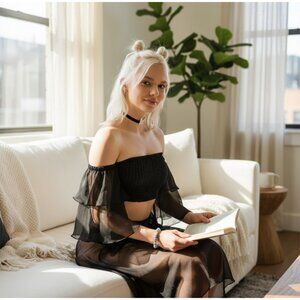 Step into an ethereal realm w/ the Club Exx “Dark Elven Priestess” top — a sheer, ruffled design that whispers of dark elegance.