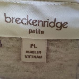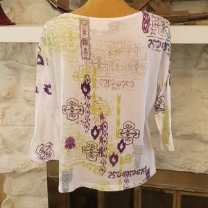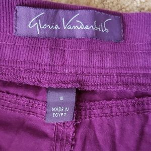 Outfit to wear for just about any occasion. Top is multicolored with accents on left shoulder. Pants match grape color in shirt . Has pockets, zipper and a tie in front. Also back pockets. Top is petite large. Pants a size 10 Gloria Vanderbilt.