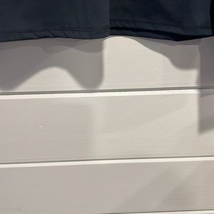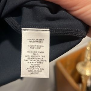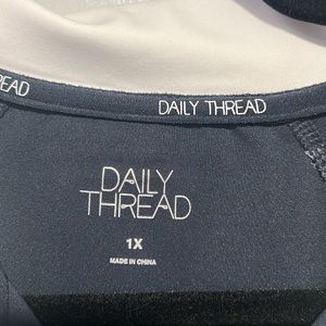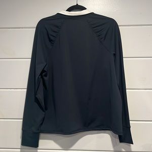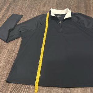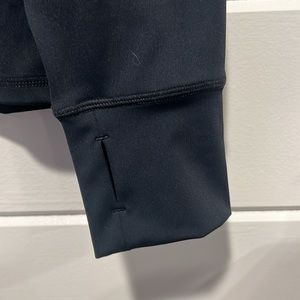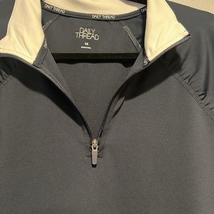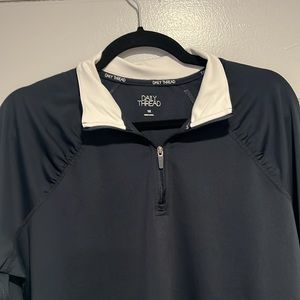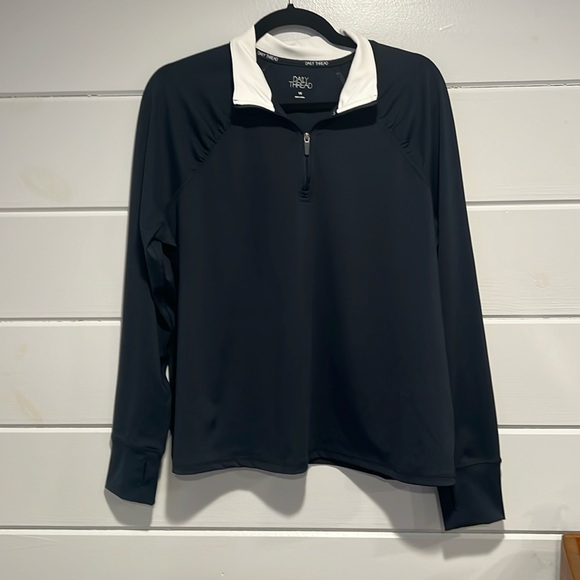 Daily Thread 1/4 zip women’s pullover with thumb holes. Fabric is 82% polyester, 18% spandex. Color is navy blue with white trim at collar.
