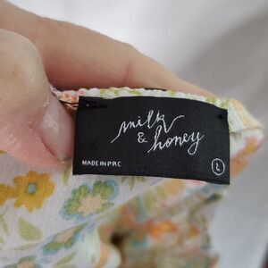 Floral Faux wrap Blouse with scalloped front, Multicolor floral, Size L by milk and honey, pit to pit 21", lace trim on front of waist, elastic waist in back with adjustable spaghetti straps, in good condition.