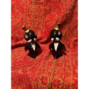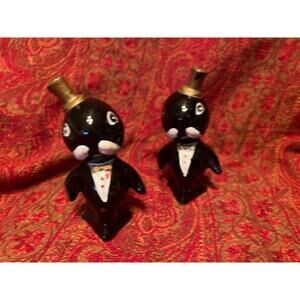 vintage Mid-Century Modern anthropomorphic walrus salt and pepper shakers. Black with gold top hat