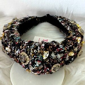 Add a touch of glamour to your outfit with this elegant black and gold embellished headband. Perfect for any occasion.