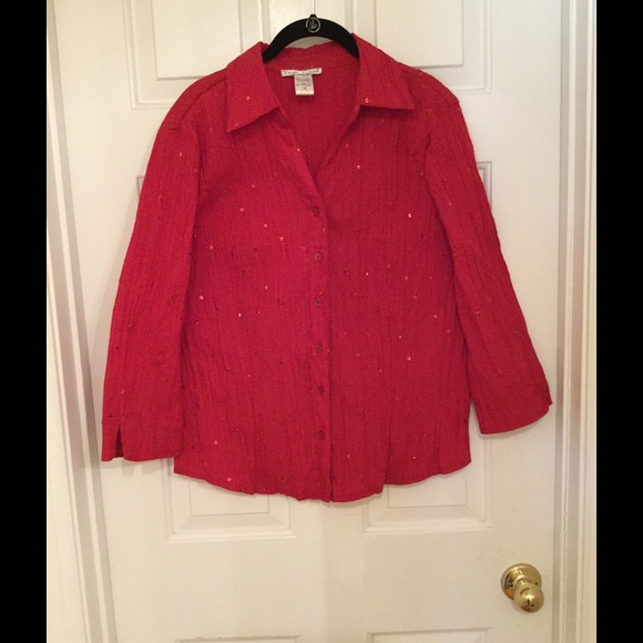 Red blouse/jacket. 3/4 sleeve. Fabric is polyester/cotton with red sparkles . Size 18. Worn 2 times at Christmas.
