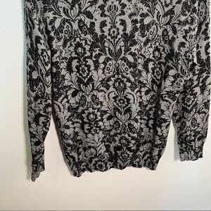 Great condition. Top Knits. Cardigan sweater. silver/ gray color with metallic knit and black paisley pattern. Button down. Crewneck. Size large. 52% cotton, 15% nylon, 13% rayon, 12% polyester, 8% metallic. Pit to pit laying flat 19” Shoulder to hem 23” Sleeve (pit to hem) 16”. All measurements are approximate and taken laying flat. Smoke free home.