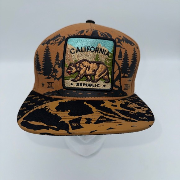 A stylish Top Level snapback hat celebrating California. This brown hat features a prominent embroidered patch on the front depicting the iconic California Republic bear surrounded by trees and mountains. The brim is adorned with a repeating black pattern of trees and mountains, with "EST. 1850" and "TOP LEVEL" subtly integrated on the sides. The back of the hat displays a small embroidered bear silhouette within a rectangular outline. Perfect for casual wear, outdoor adventures, or showing off your California pride.