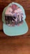 Vibrant cap with 'Hustle' design. Features a mix of colors and a light turquoise color green brim.