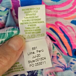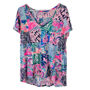 Top Lilly Pulitzer v neck short sleeve high lo multi color patchwork print Large