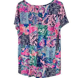 Lilly Pulitzer pink, white, blue, coral, green patchwork print top is a size Large.