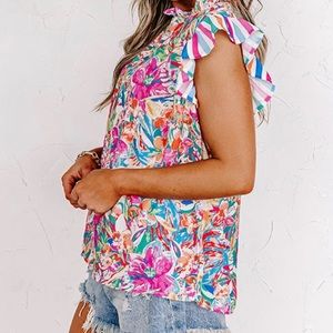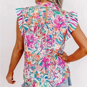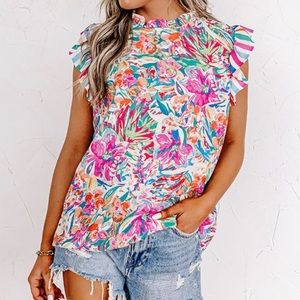 High neckline w/ruffled edge, sleeveless, ruffle detail & keyhole button closure