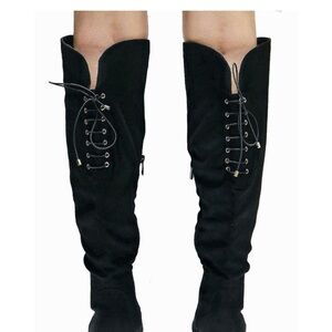 These chic black over-the-knee boots from Top Moda are the perfect addition to your shoe collection. Featuring a suede-like material, a comfortable low block heel, and a lace-up detail at the back for an adjustable fit, these boots are both fashionable and versatile. Ideal for casual outings or more dressed-up events, these boots are brand new, never worn, and still tied together. Size 8.