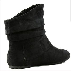 Super cute slouch booties by Top Moda, Pad-51 ( Faux Suede) with large decorated buckle. Made of man made suede material, ankle height, flat heel. I have 1 black pair-1 gray- size 7. Fits true to size, very comfortable. (I do have a gray pair size 7.5 in another listing.) Looks cute with dresses, pants or shorts. Very versatile!
