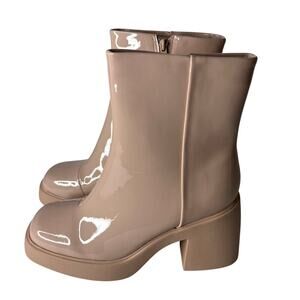 Top Moda Marino Patent Chunky Booties in Tan. Size 8.5. Features square toe, patent upper, side zipper closure, and chunky sole. Excellent pre-owned condition.