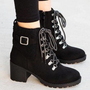 NEW Top Moda Nordstrom Pluto Boots Black Faux Shearling Cuff Buckle Lug Sole Bootie Size 6.5 NIB