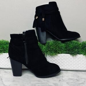 • These booties feature a round toe design, stitching accents, side zip closure, and tassel detailing.